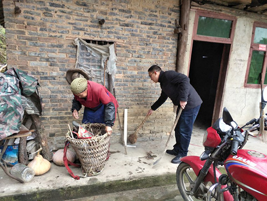各组干部各自手持铁锹、抹布等工具,帮助贫困户清扫庭院、清运垃圾、擦玻璃等,并对贫困户家中生活物品摆放进行统一整理,引导贫困户养成文明健康生活习惯,鼓励他们坚定改变贫困落后面貌决心。